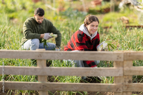 Farm couple working on green onions plantation, picking ripe organic vegetables
