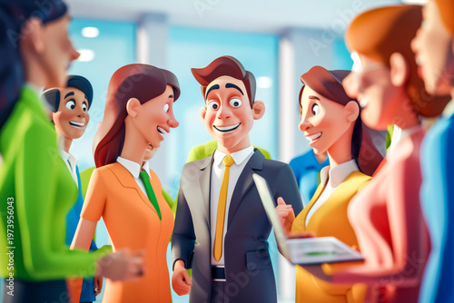 3D cartoon business professionals are seen engaging in vibrant conversations during a modern networking event. The atmosphere reflects the energy of digital era collaboration.