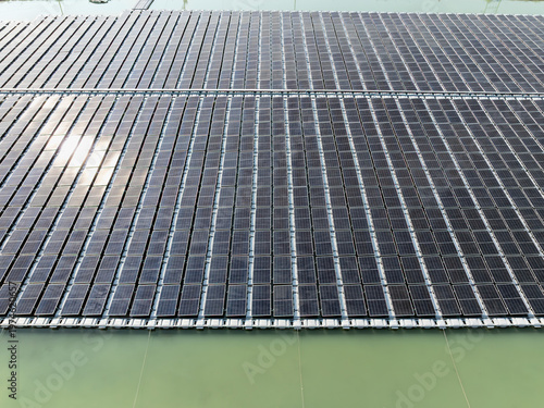 Floating solar farm on a large pond for sustainable poultry farming energy. Alternative energy.