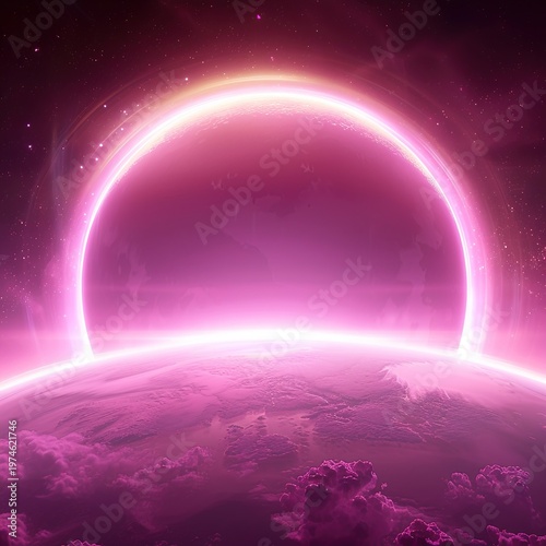 A vibrant pink neon arch glowing above a planet in space