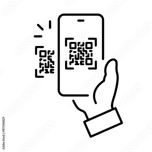Scan QR code icon. Payment hand with phone, scanner app, payment and data transfer. Thin line symbol on transparent background. Editable stroke vector illustration.