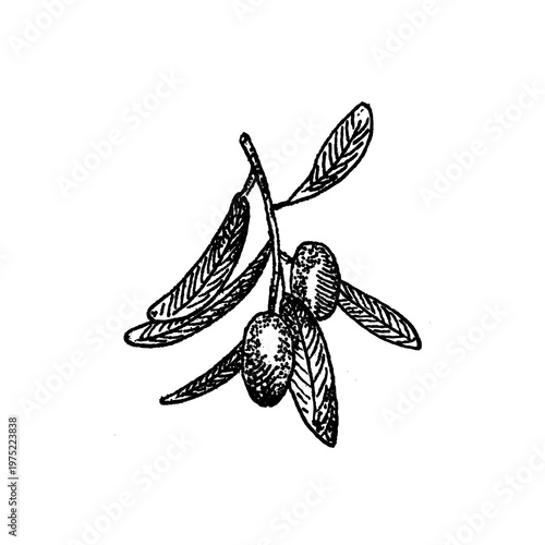 Vintage engraving of olive branch with fruits, classical botanical line art sketch.