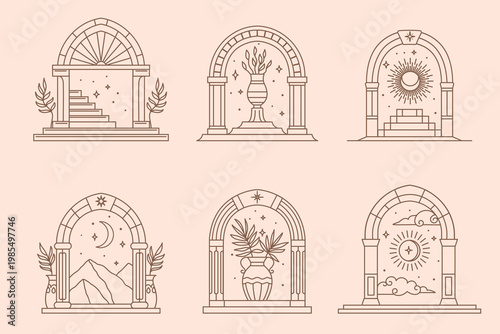 Boho heaven arch icons, castle gate door frames with vector line sun, moon and stars, palm leaves in vintage vases, stairs and mountain landscape. Mystery arch and celestial gates with boho ornaments