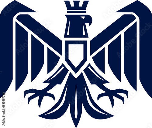Royal eagle with crown, heraldic icon or emblem for heraldry, vector coat of arms. Gothic style medieval eagle with shield and imperial crown with wings feathers spread and claws for heraldic sign