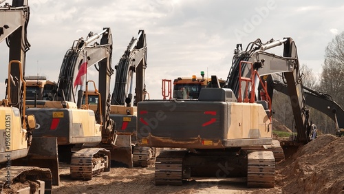 Nowoczesne koparki gąsienicowe Volvo na placu budowy: ciężki sprzęt budowlany gotowy do prac ziemnych i infrastrukturalnych w trudnym terenie