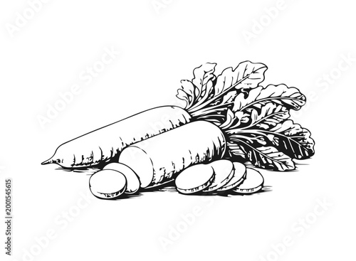 Simple hand drawn white radish sketch, engraved japanese daikon vegetable illustration.