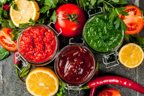 Indian traditional food, Set of three chutney for Chaat and Sev Puri - sweet date-tamarind, cilantro-mint green and red chilli garlic, On dark stone background, close top view