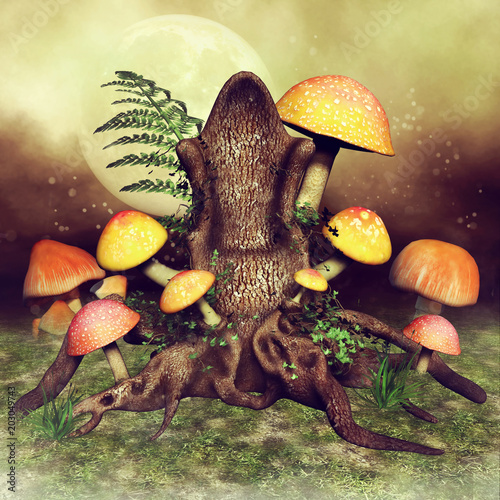 Tron z pnia drzewa z kolorowymi grzybami i paprocią