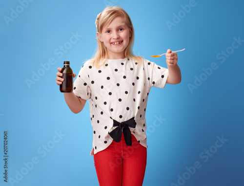smiling girl giving spoon of children's suspension on blue