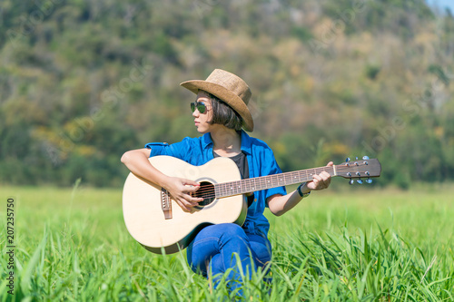 Women short hair wear hat and sunglasses sit playing guitar in grass field