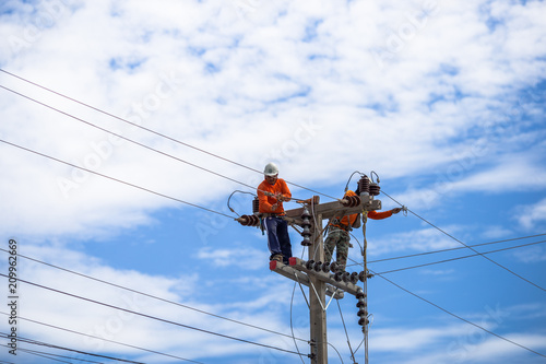 14 june 2018:The electricians are repairing and putting on new wires to keep up the light at night. Must use specialized capabilities in the work In Phetchaburi Province, Thailand