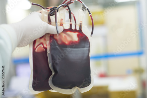 Red blood bag in hand scientist.