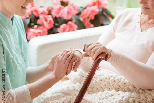 Closeup of a caring volunteer working in a retirement home holding a senior, disabled woman's hand