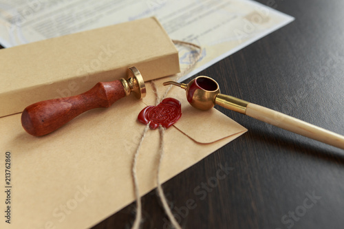 Contract waiting for a notary public sign on desk. Notary public accessories