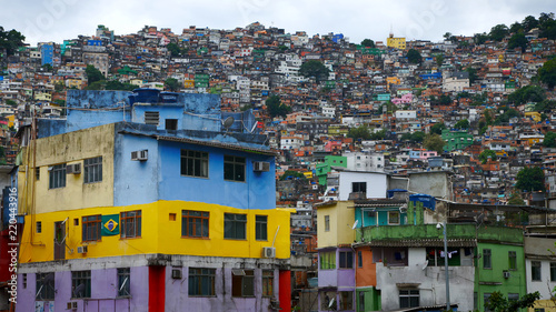 Aerial view of Rio's Rocinha favela, on a sunny afternoon.