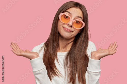 Indoor shot of clueless dark haired pretty young woman with doubtful expression, spreads palms with hesitation, wears casual white jacket and sunglasses, isolated over pink background. What to do?