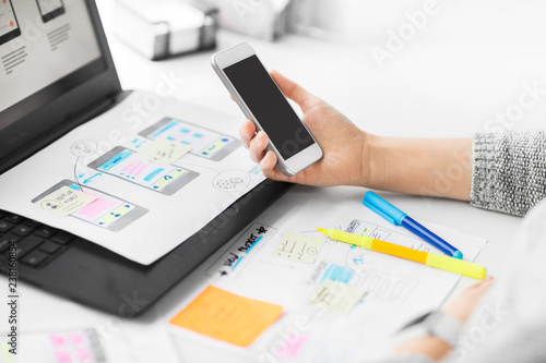 app design, technology and business concept - web designer or developer with smartphone and laptop computer working on user interface at office