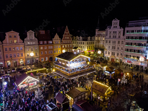 Wieczorny widok z powietrza na jarmark bożonarodzeniowy na rynku