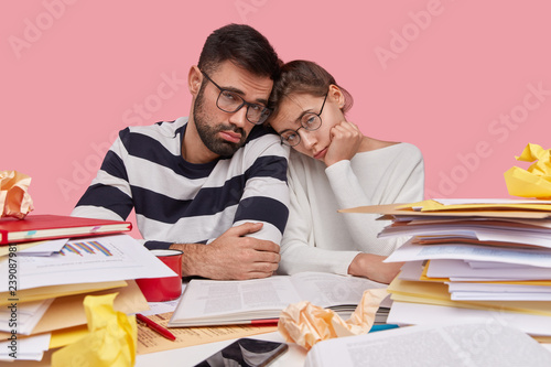 People, collaboration and tiredness concept. Unhappy woman and man sit closely, have dejected facial expressions, fatigue of preparing diploma paper, have much paper work, isolated over pink wall