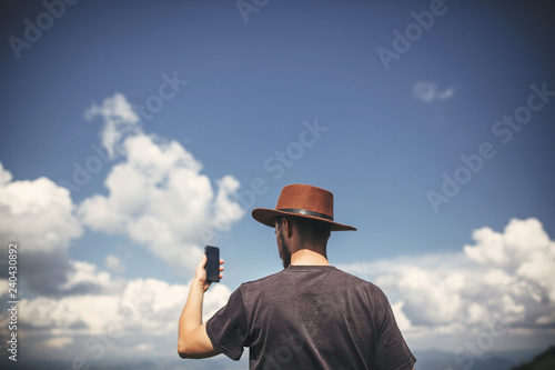 Stylish hipster traveler holding phone, standing on top of hills on background of summer mountains. Copy space. Travel and wanderlust concept.