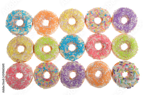 Flat lay view of many Frosted donuts with candy sprinkles isolated on white