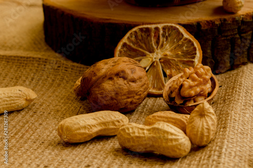 Orzechy ziemne i włoskie rozrzucone luzem na płótnie.