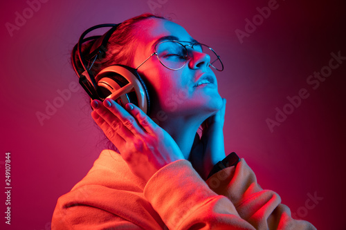 Fashion pretty woman with headphones listening to music over red neon background at studio.