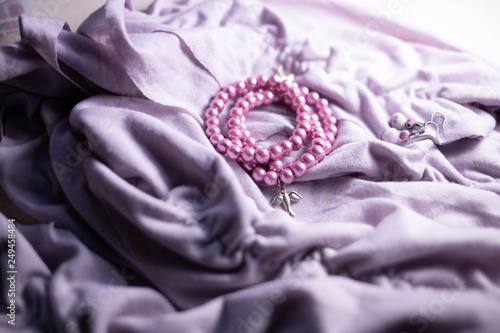 Bransoletki i kolczyki na fioletowym szalu