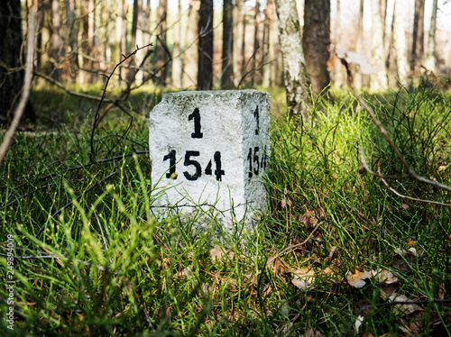Biały słupek oddziałowy graniczny leśnictwa w lesie w Polsce