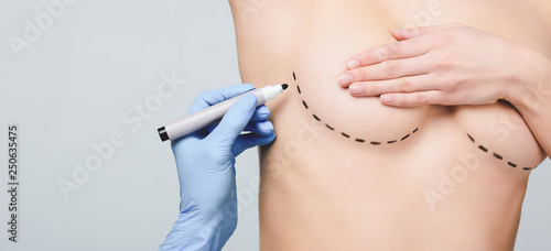 cropped view of plastic surgeon marking lines under breast, isolated on grey