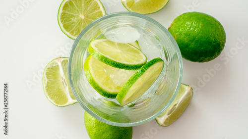 Woda z limonką w otoczeniu pokrojonej limonki na białym tle