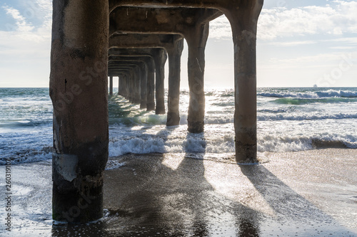 Late afternoon sun underneath the Manhattan Beach Pier along the Pacific Ocean coastline in Southern California