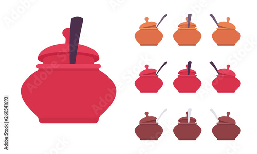 Pot set, kitchen appliance. Round lidded cauldron for storage, serving, sugar bowl, kitchenware accessory. Vector flat style cartoon illustration isolated on white background, different views, colors