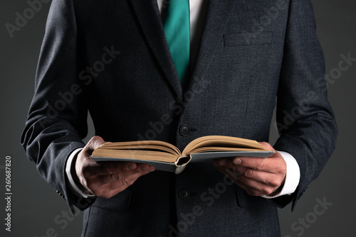 Business man is reading a book in his hands on a gray background. Business education. Ledger.