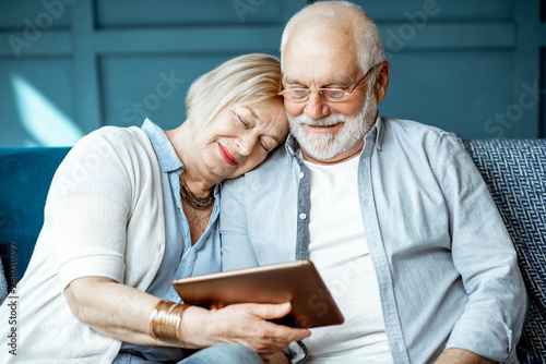 Lovely senior couple dressed casually using digital tablet while sitting together on the comfortable couch at home