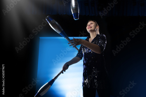 Circus actress performs. Girl juggles with maces on a dark background in the spotlights.