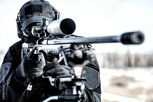 Equipped police SWAT sniper shooting with rifle