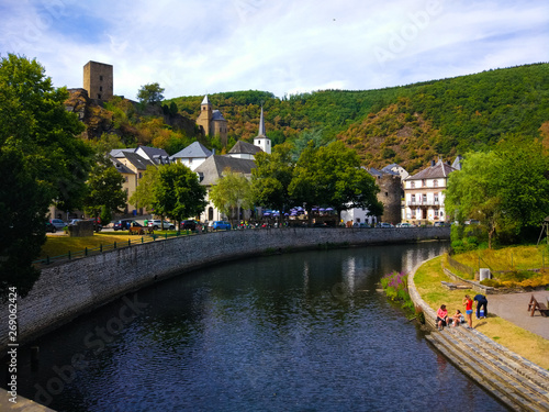 Sure river through Esch-sur-Sure with Esch-sur-Sure Castle at the background, in Luxembourg. People playing in the riverside