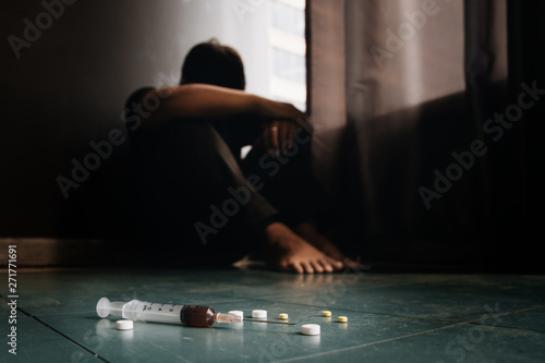 Conceptual image on the subject of drug addiction.man sitting and hugs his knees. depression self destruction suicidal addicts drug