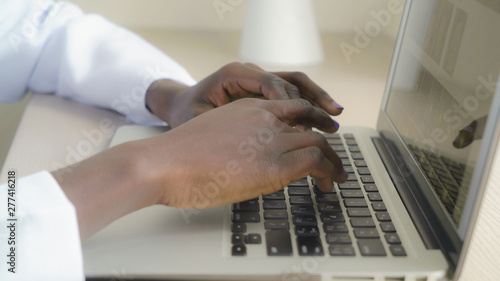 Closeup detail doctor typing on laptop. Female hands entering data on keyboard pc.