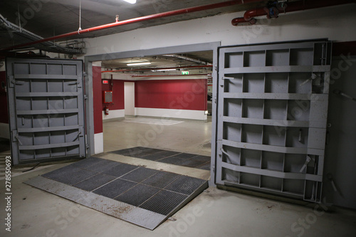 Details with the heavy metal doors of a nuclear explosion shelter (fallout shelter), four stories below ground in a deep underground parking place.