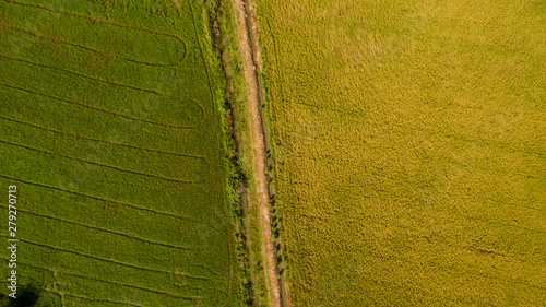 Aerial view shot from drone of the beautiful paddy fields with green young sprouts in farming organic harvest with rice. Image of beautiful Terraced rice field in water season take photo from drone.
