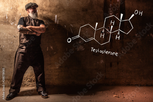 Bearded old man presenting handdrawn chemical formula of testosterone
