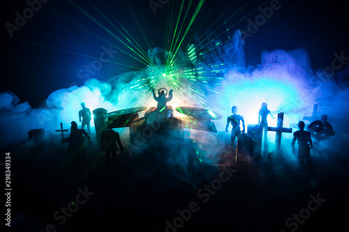 Scary view of zombies at cemetery dead tree, moon, church and spooky cloudy sky with fog, Horror Halloween concept. Toned