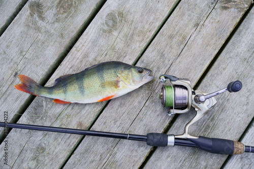European perch close-up on a wooden pier and spinning. Perca fluviatilis