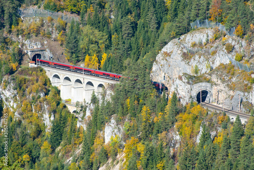 Red train on a viaduct between two tunnels on the Semmering Railway. The Semmering Railway is the oldest mountain railway of Europe and a Unesco World Heritage site.