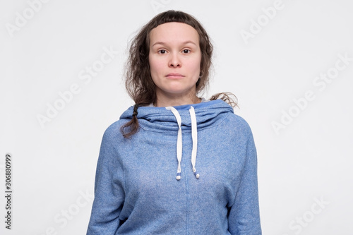Emotionless, unsentimental phlegmatic caucasian teenager with serious look looking at camera.