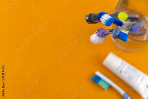 Toothbrushes in glass on orange background - close up top view