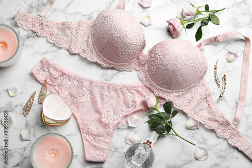 Flat lay composition with women's underwear on marble background