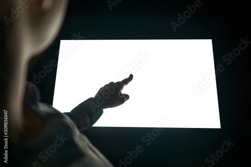 Mockup image - woman touching white empty interactive touchscreen display kiosk in dark room of modern technology museum. Mock up, template, scifi, education, futuristic and technology concept